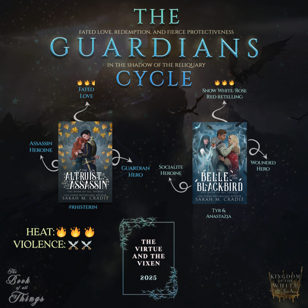The Altruist and the Assassin is a fated love fantasy romance tale set in the Kingdom of the White Sea universe, with hints of Rapunzel and Sleeping Beauty. It is the first story in the Guardians Cycle of The Book of All Things.